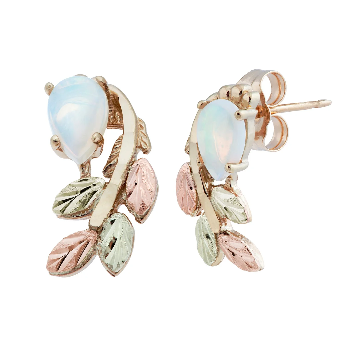 Black Hills Gold cascading opal earrings with 12 karat cascading rose and green gold leaves around a pear shaped opal stone on a post.