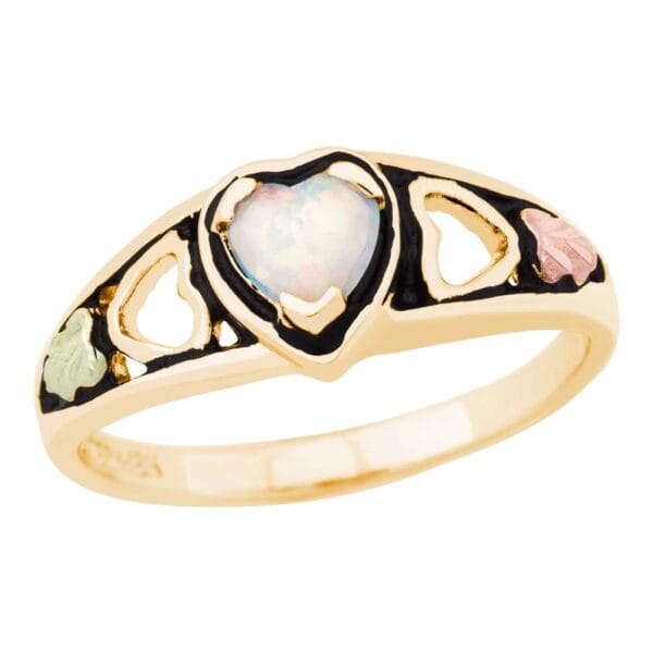 This popular and beautiful Landstroms 10 karat heart ring features a 5x5mm lab-created* opal gemstone set on the inside a heart. It also features 12 karat Black Hills Gold leaves within baked black enamel as its background. While the opal is considered a gemstone for October, this ring makes a perfect gift for anyone!