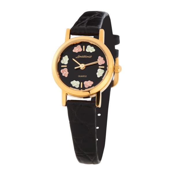 This elegant Landstrom’s wrist watch with black round face has eight 12 karat Black Hills Gold leaves, quartz movement, stainless steel back and a leather watch band. 1 year limited warranty.
