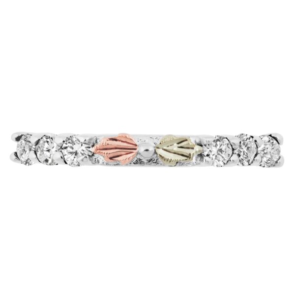 Lovely 10 karat White Gold Shank, accented with (6) 2MM Clear Cubic Zirconia Stones and 12 karat Green and Rose Leaves.