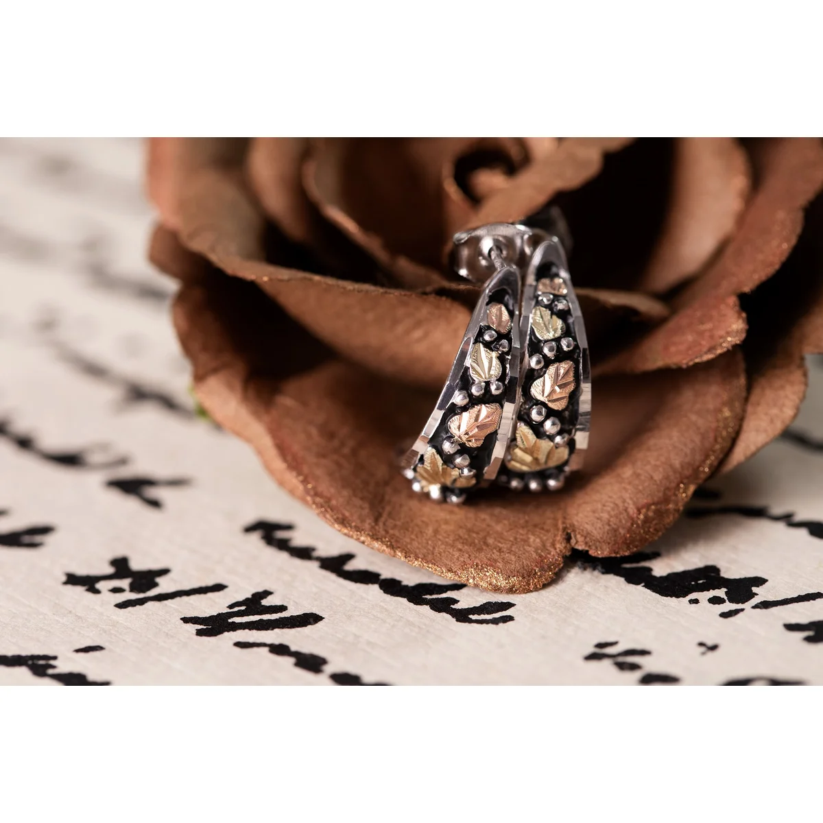With 12 karat Black Hills Gold leaves set in black enamel, these elegant sterling silver earrings from Landstroms feature surgical steel posts and won’t disappoint!